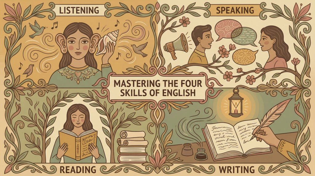 Language is more than words it’s a living skill that connects people, ideas, and cultures. To truly become fluent in English, learners must develop balance across four essential skills: listening, speaking, reading, and writing. Each one supports the others, and together they build complete communication ability.